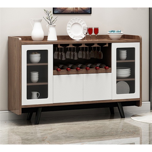 3、备餐柜左右两边及上部抽屉和柜门结合的封闭式空间搭配中间可上下调节的酒格设计别出心裁,增大储物空间的同时更方便您陈列各式美酒;四个支撑脚设计,使备餐柜结构更加稳固。
