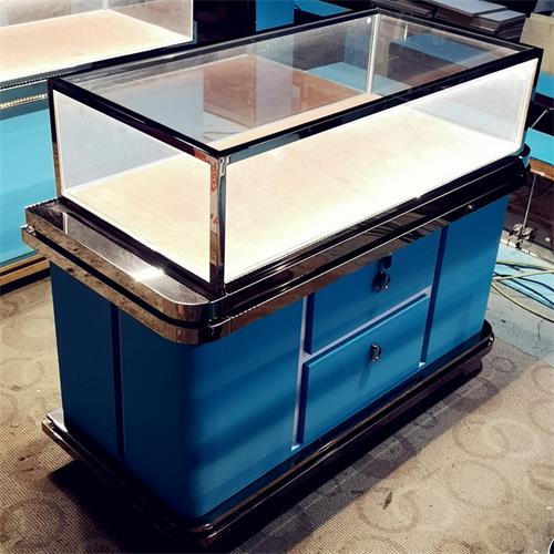 最大的目的是掀起珠宝的独特之美,吸引顾客的眼球。此款展柜采用简约设计,质感层次丰富,搭配海蓝色地柜更显奢华韵味,配合整体颜色搭配更显高档贵气。珠宝展示柜具有很强的装饰性,放置的商品可以与消费者保持距离。