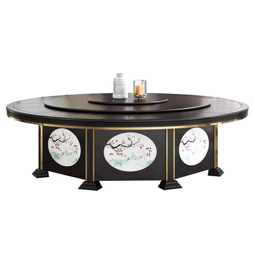 。这款饭店包房新中式实木智能自动旋转餐桌装饰花纹采用烙烫工艺,摆脱了传统的木工雕花的费时费工,成本居高不下,或者即使是电脑雕花装饰有感觉没有艺术感,并且烙烫技术应用到饭店包房新中式实木智能自动旋转餐桌上永远不会掉色,花纹全靠师傅的艺术审美,每一台饭店包房新中式实木智能自动旋转餐桌毫不夸张的说都是一件独一无二的艺术品,值得拥有。