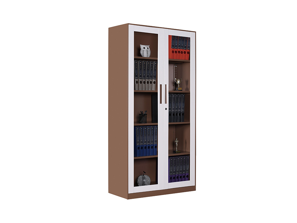● 一体结构设置,上部玻璃对开门,内置1层层板可调高度,内置物品可视,便于拿取,中间2个抽屉,下部对开铁门、门内一格板,设置有拉手和锁。