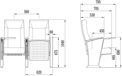 2.座椅基本中心距为:560±10mm,座包打开侧深为:705±10mm,写字板打开侧深为:795±10mm,椅高为:1040±10mm,最小排距:900mm。